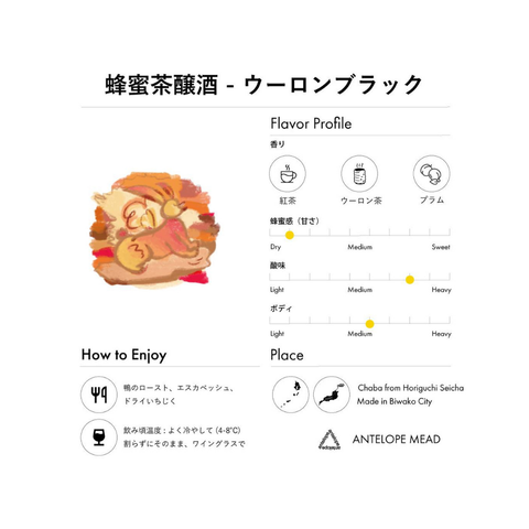 紅茶と烏龍茶の中間に位置する75%発酵茶葉「ウーロンブラック」を使用。​茶葉の裁断歩合や抽出タイミングを工夫し、プラムのような酸と香りが特徴の酵母で高温発酵。​瓶内二次発酵で仕上げた発泡性のミードです。