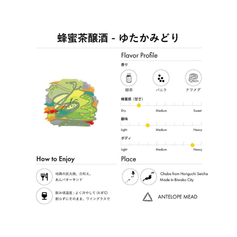 鹿児島県志布志産の伝統的な品種「ゆたかみどり」の深蒸し茶を使用。​水出しとお湯出しで抽出した茶葉をブレンドし、ウィスキー樽で熟成させてほのかなバニラ香を加えました。​非加熱で瓶詰めされた特別なミードです。​